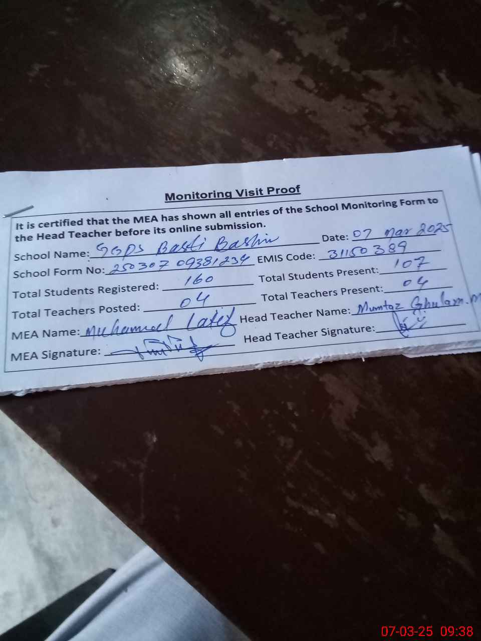 | EMIS Code: 31150389 | Name of School: GGPS BASTI BASHIR | |||