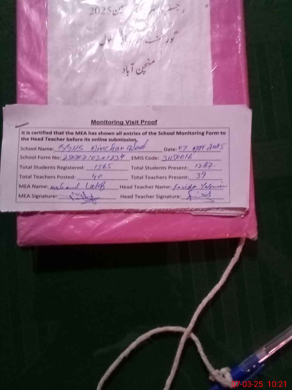 | Certified that this School was Inspected by the Undersigned MEA/DMO Today and the Information Stated Above is as Per Record. | |||||