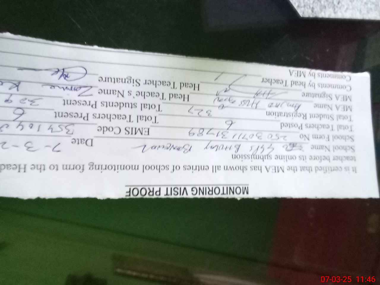 | Attendance Register | Head Teacher | MEA with School | Visit Proof |