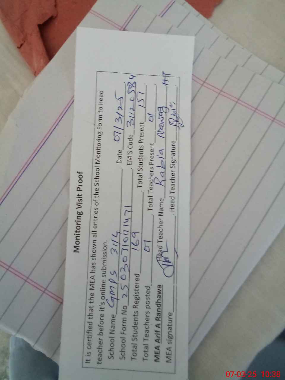 | Attendance Register | Head Teacher | MEA with School | Visit Proof |