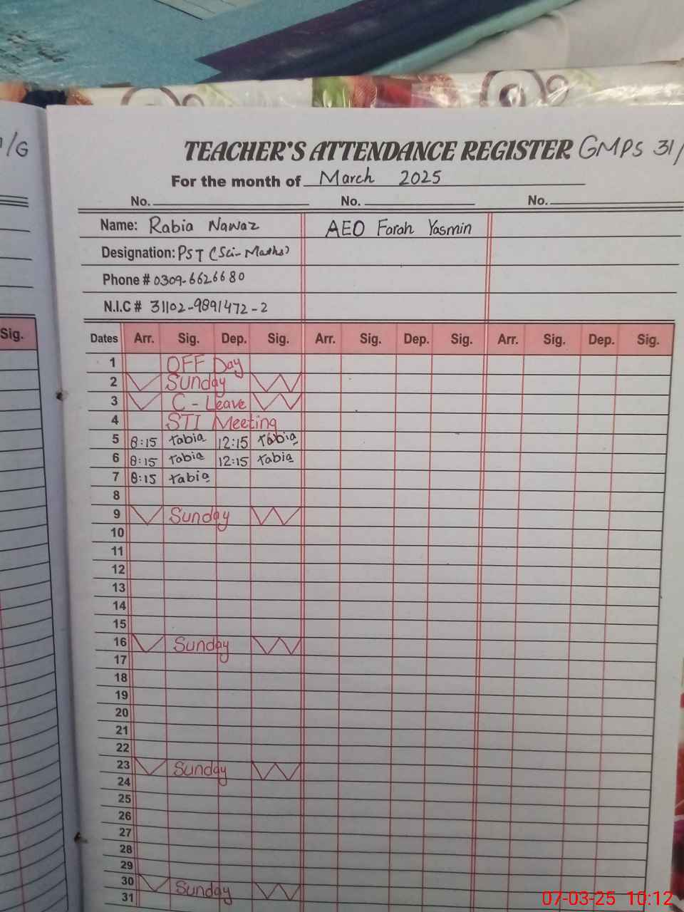 | Name: RA**** NA**** Designation: (School Headmaster's/Headmistress's) PST Phone/Cell Number: 03**** |