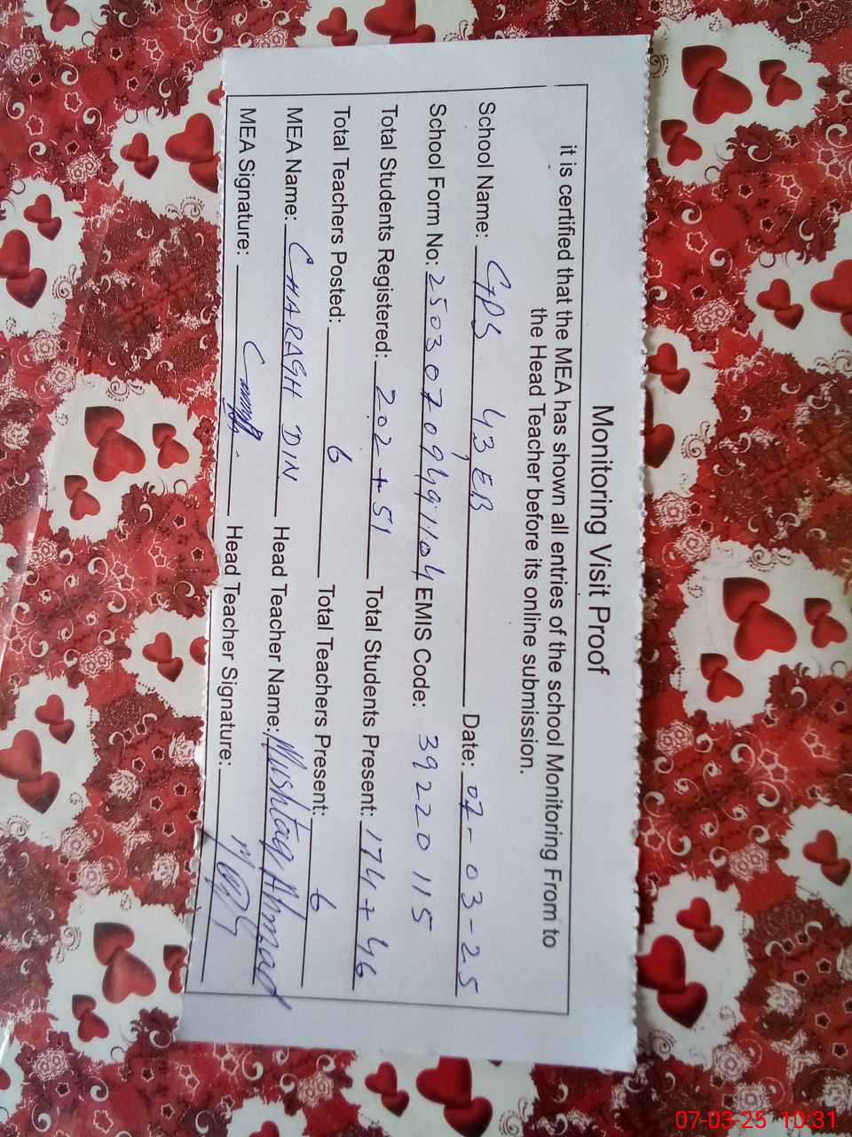 | Certified that this School was Inspected by the Undersigned MEA/DMO Today and the Information Stated Above is as Per Record. | |||||