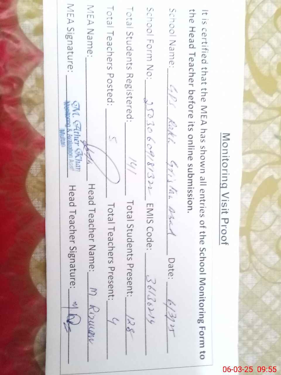 | EMIS Code: 36130214 | Name of School: GPS RAKH GRISTAN ABAD MAKHDUM RASHEED MULTAN | |||