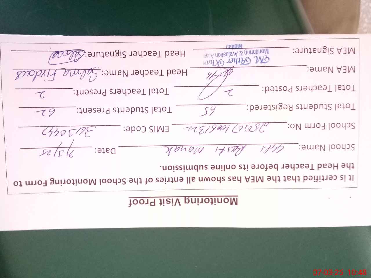 | Certified that this School was Inspected by the Undersigned MEA/DMO Today and the Information Stated Above is as Per Record. | |||||