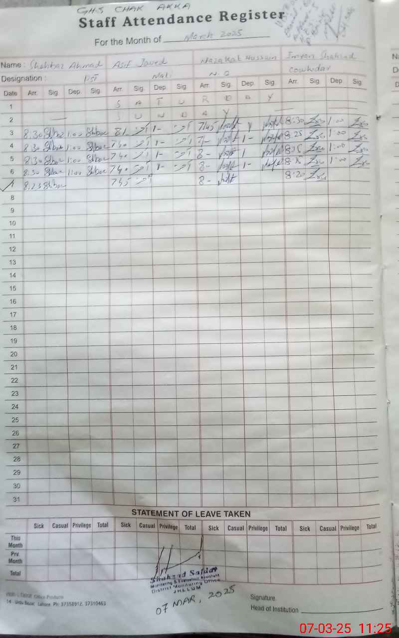 | Name: Fa**** Ta**** Designation: (School Headmaster's/Headmistress's) Headmaster Phone/Cell Number: 03**** |