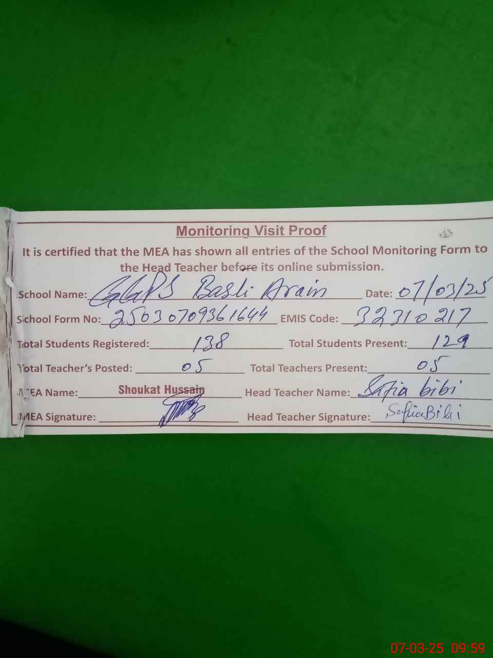 | EMIS Code: 32310217 | Name of School: GGPS BASTI ARAIN | |||