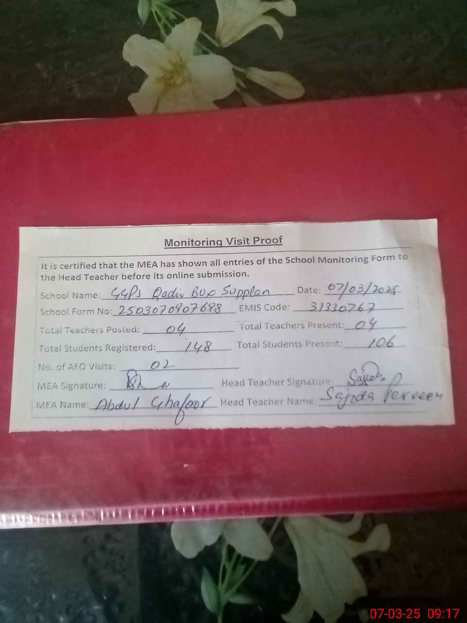 | EMIS Code: 31330767 | Name of School: GGPS QADAR BUX SUPPLAN | |||