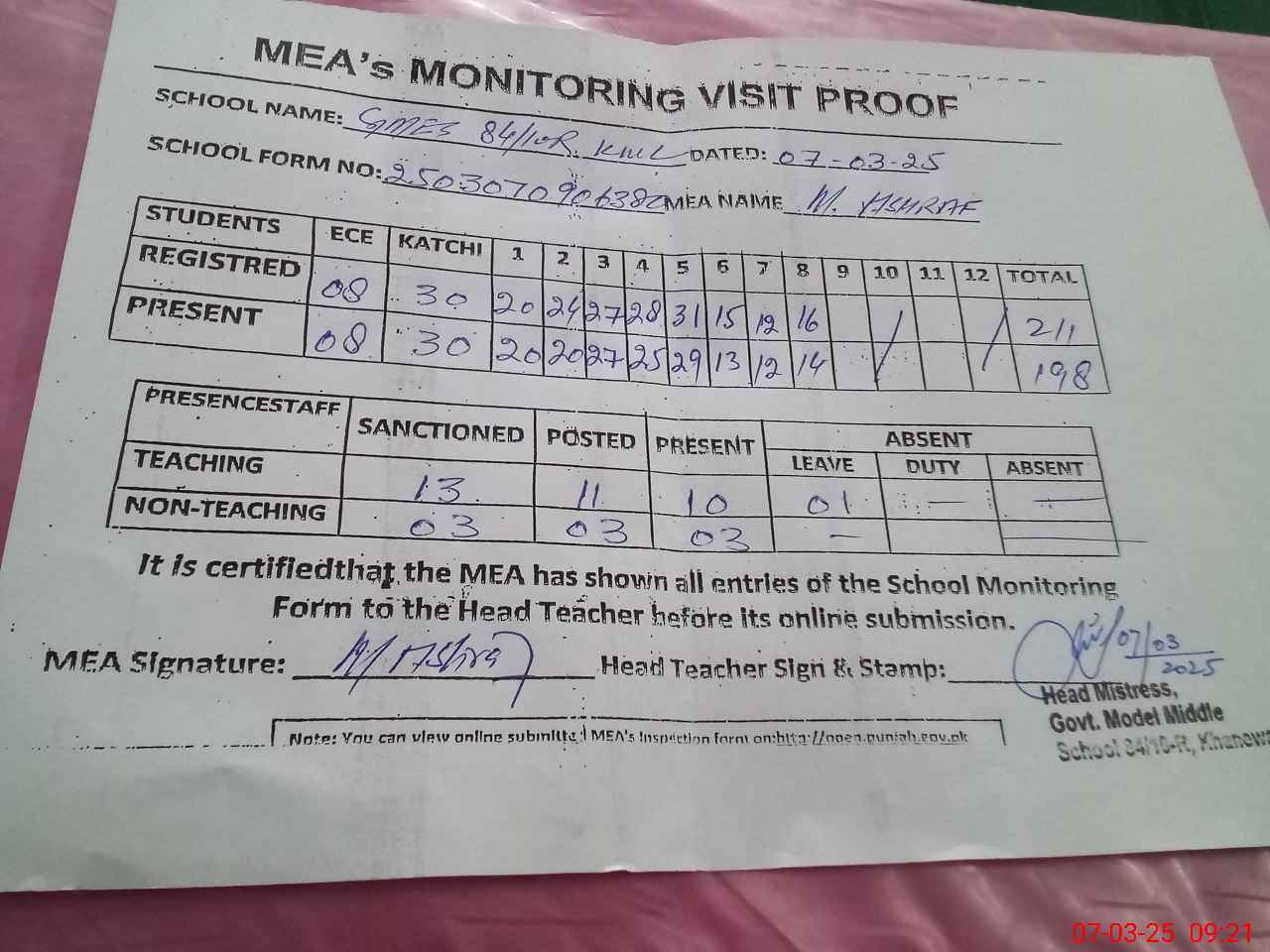 | EMIS Code: 36420426 | Name of School: GMES 84/10-R, KHANEWAL | |||