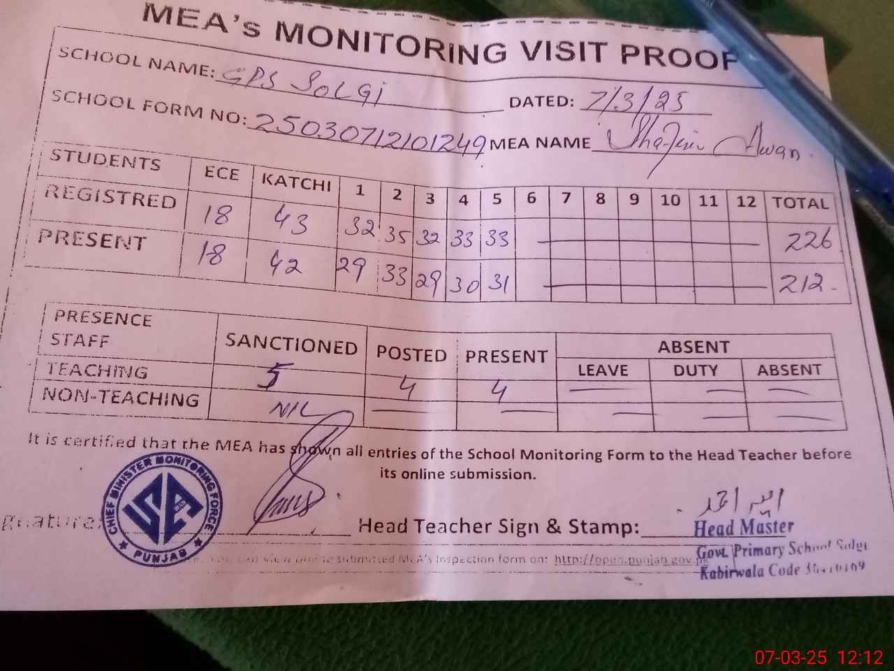 | EMIS Code: 36410169 | Name of School: GPS SOLGI, P/O JAWIND SING WALA, KABIRWALA | |||