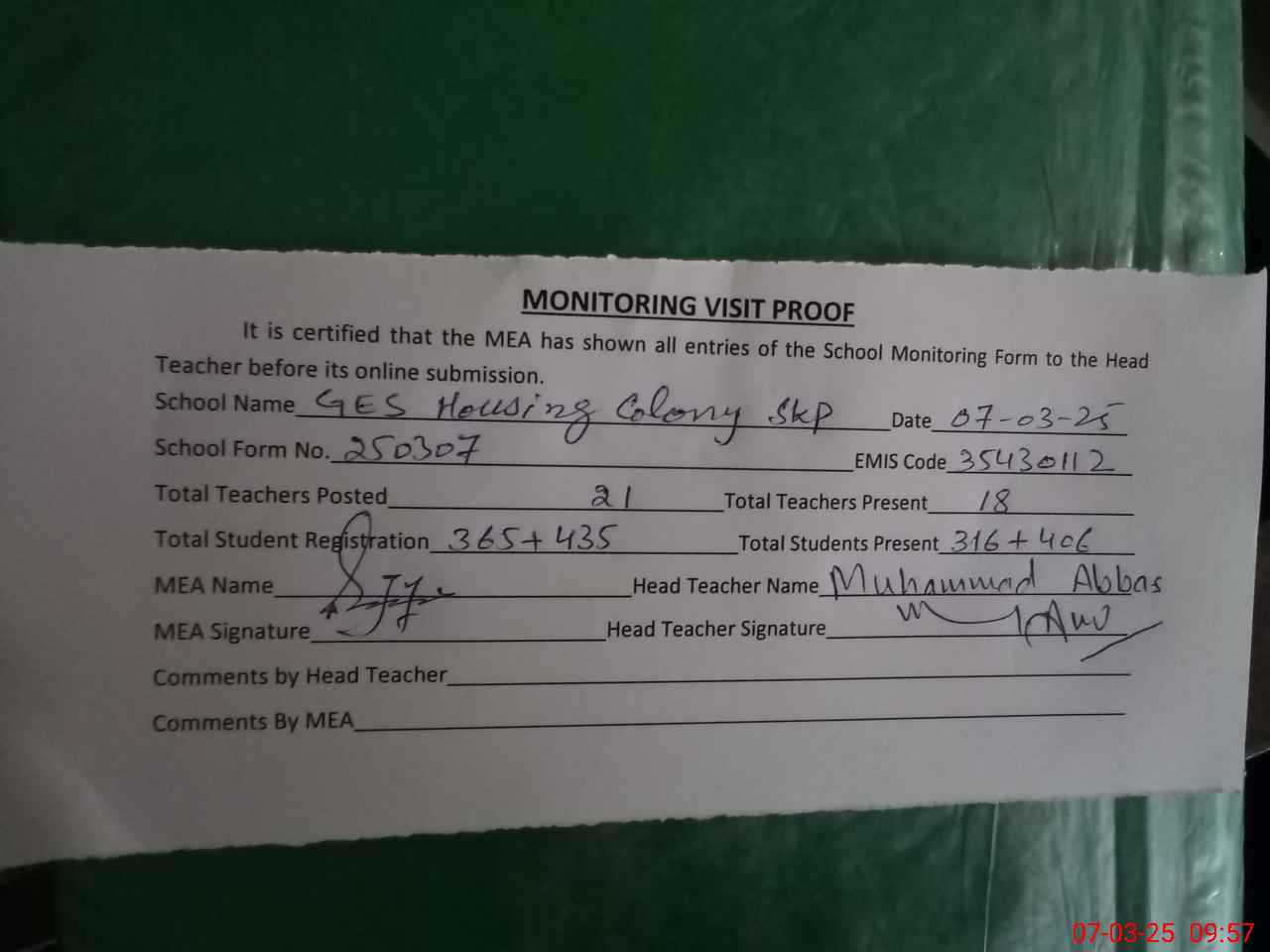 | Attendance Register | Head Teacher | MEA with School | Visit Proof |