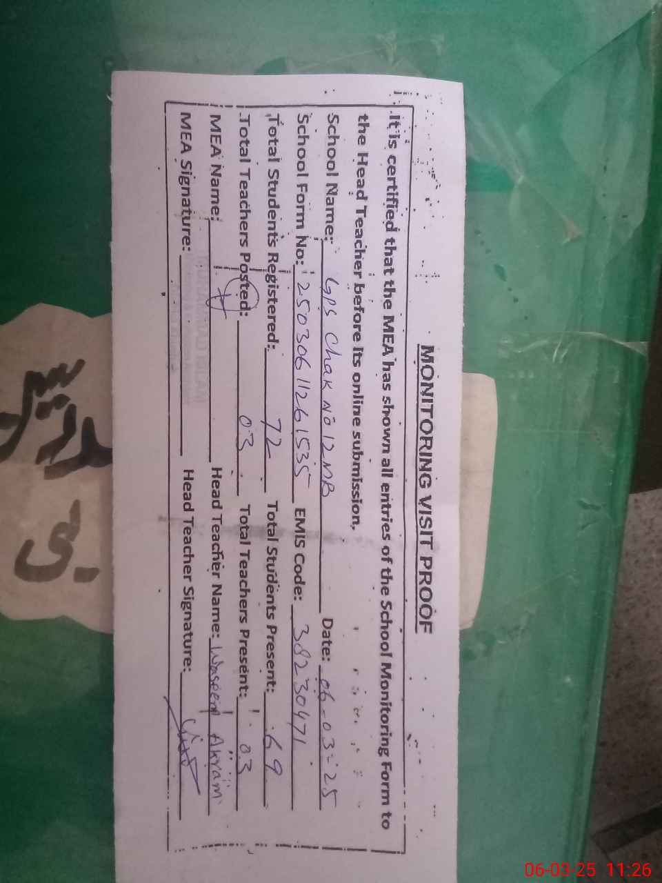 | EMIS Code: 38230471 | Name of School: GPS CHAK NO. 12 MB | |||