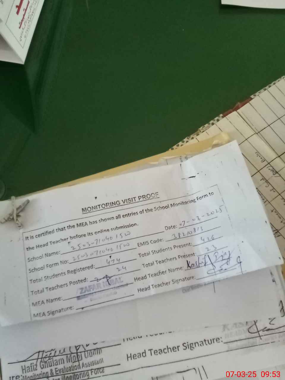 | Attendance Register | Head Teacher | MEA with School | Visit Proof |