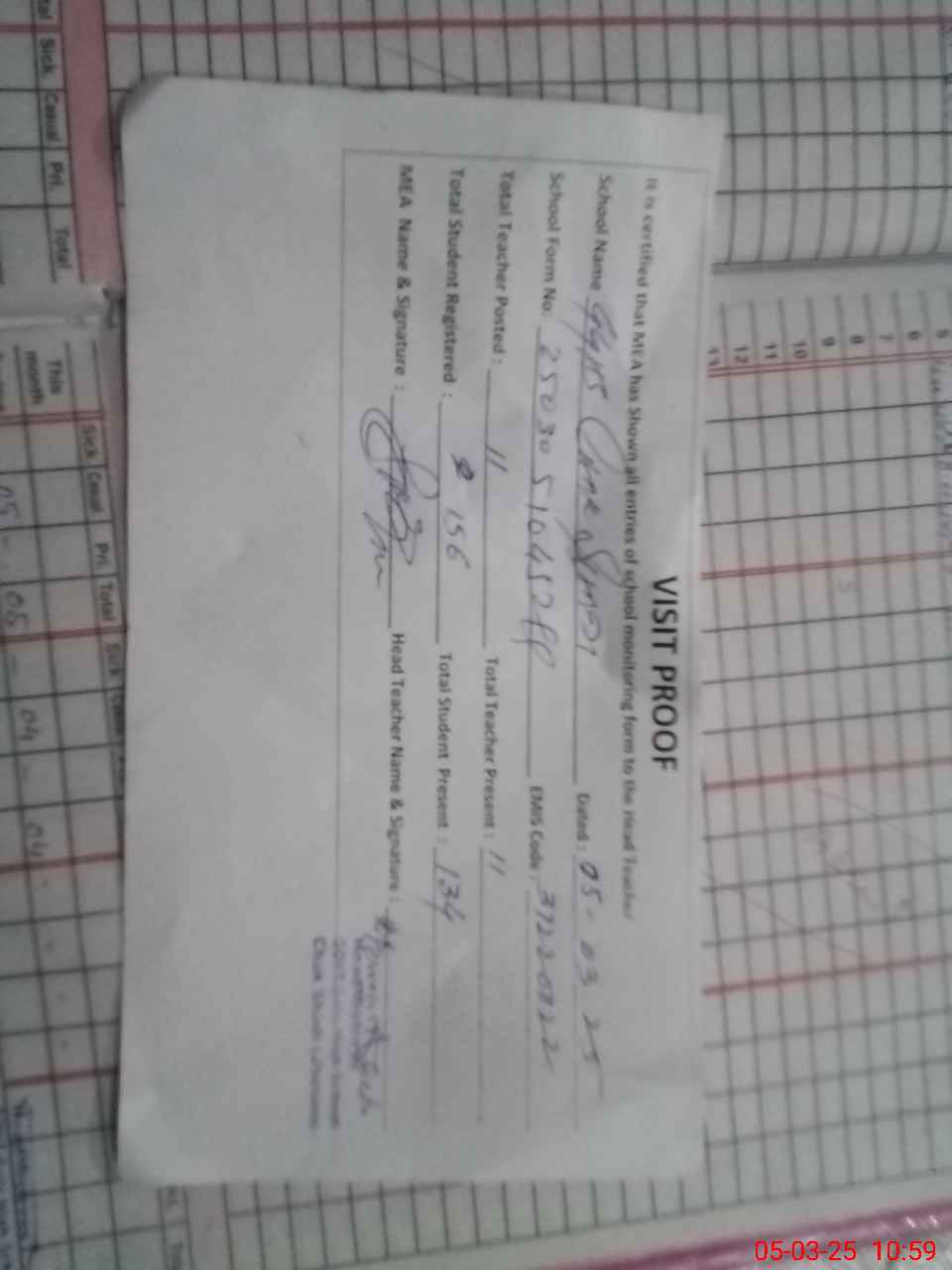 | Attendance Register | Head Teacher | MEA with School | Visit Proof |