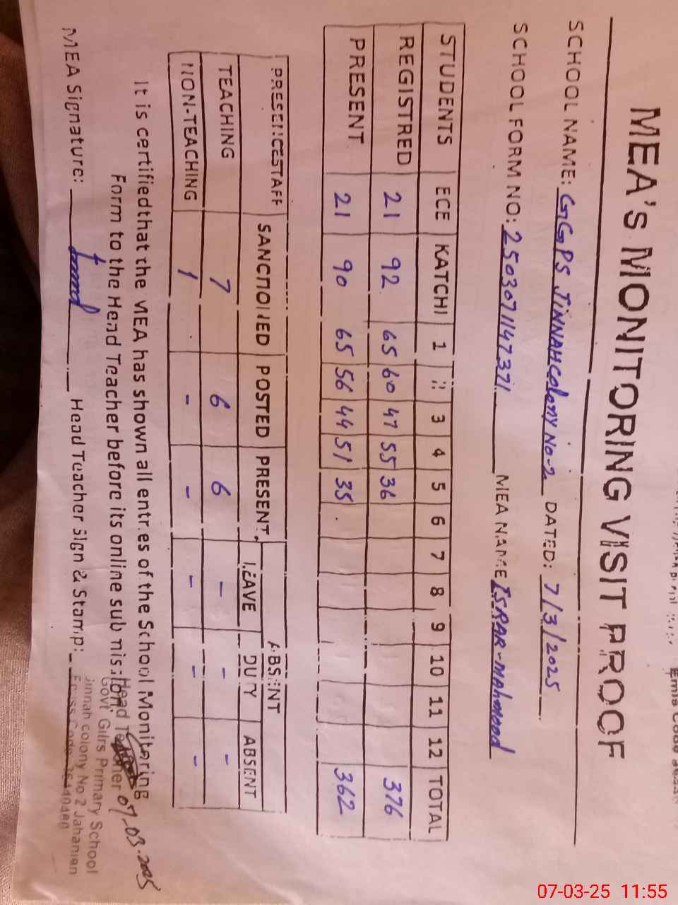 | Attendance Register | Head Teacher | MEA with School | Visit Proof |