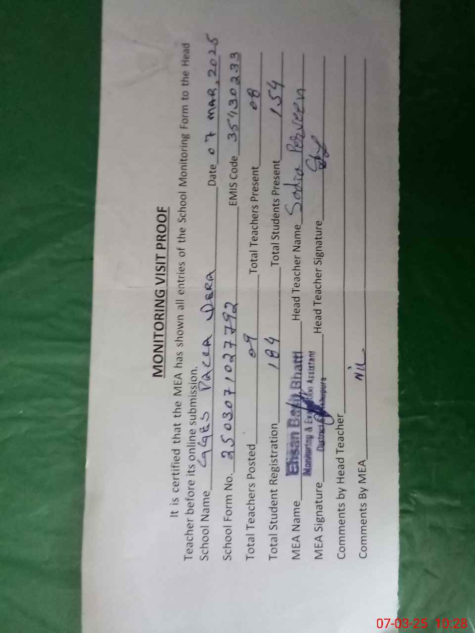 | Certified that this School was Inspected by the Undersigned MEA/DMO Today and the Information Stated Above is as Per Record. | |||||