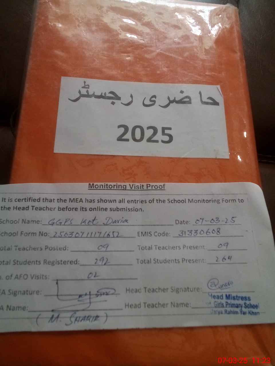 | Attendance Register | Head Teacher | MEA with School | Visit Proof |