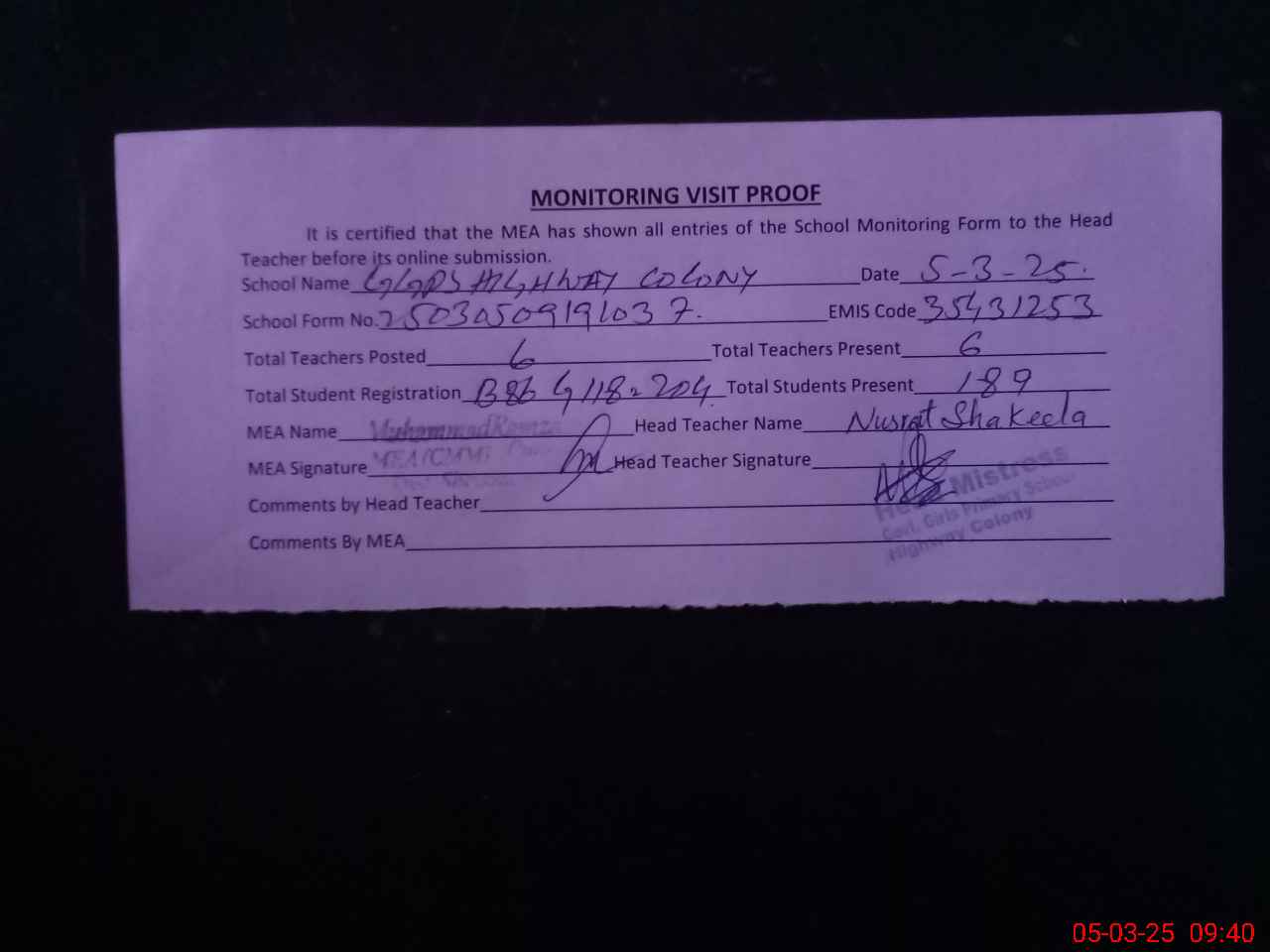 | Attendance Register | Head Teacher | MEA with School | Visit Proof |