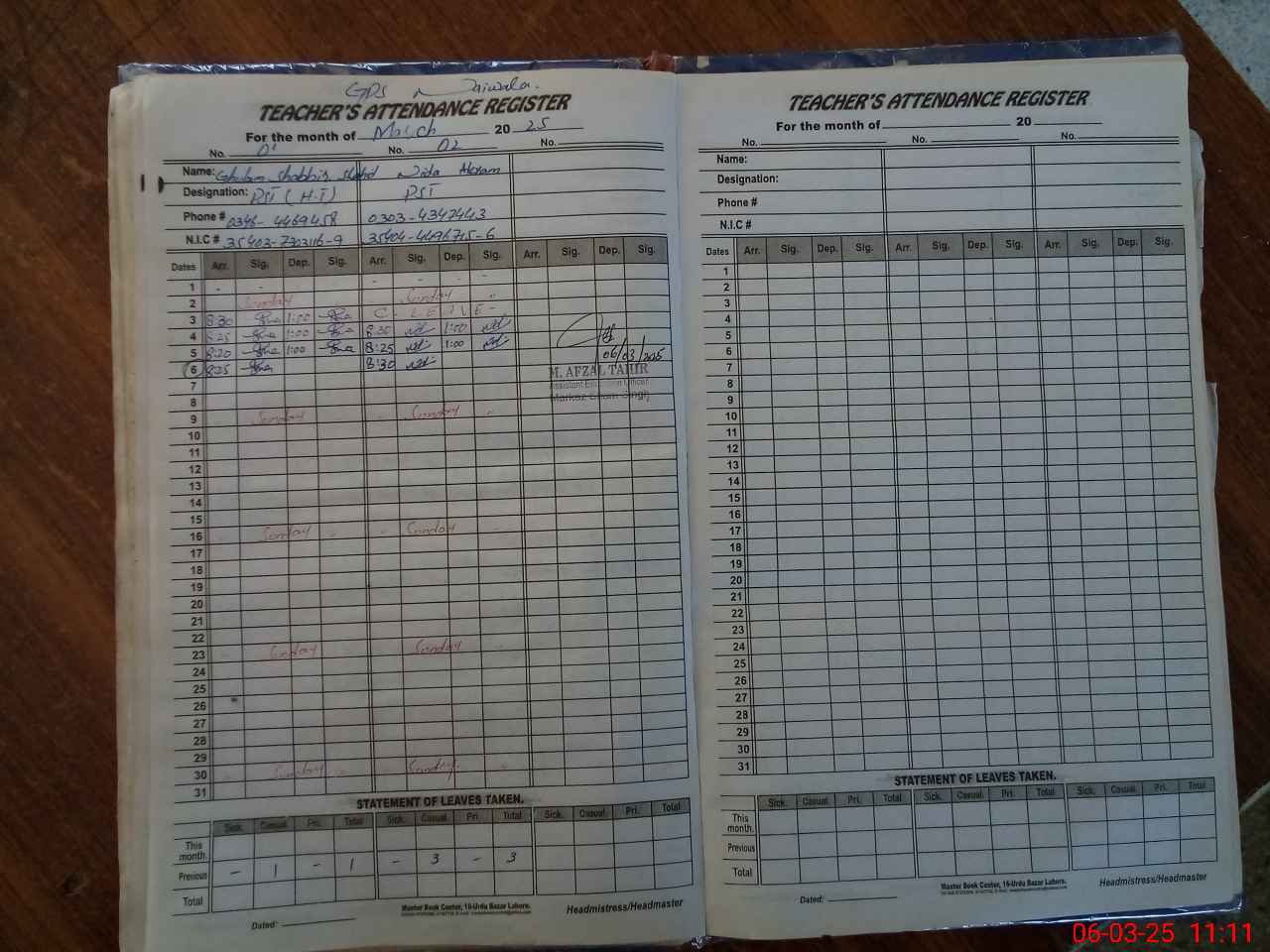 | CNIC | Full Name | Designation | R/C | Absence During Last Calender Month |