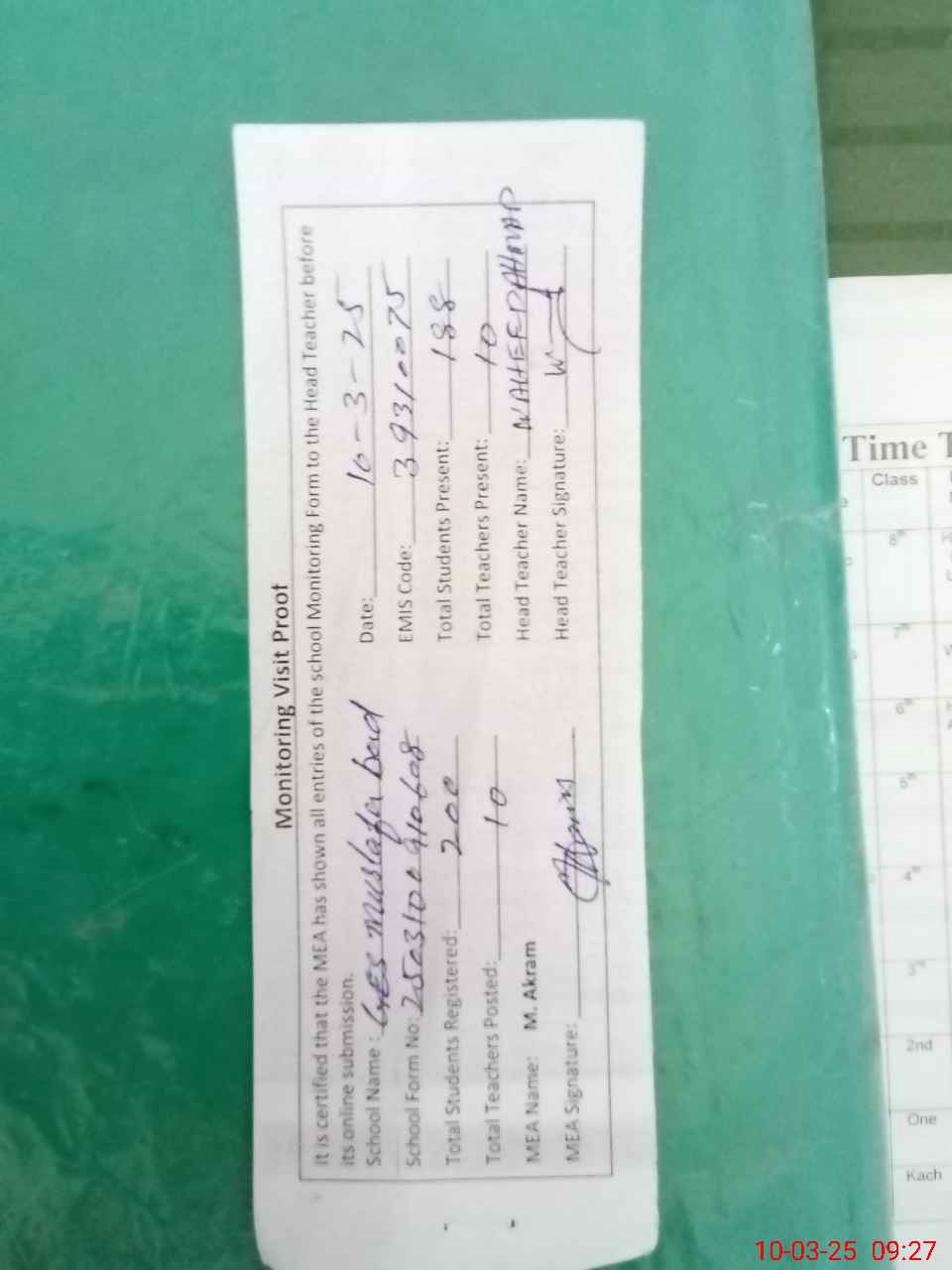 | Monitoring Date: 10-03-2025 | Start Time: 10-03-2025 09:10 AM | End Time: 10-03-2025 09:34 AM | Name of MEA: MU**** AK**** (R**** | |