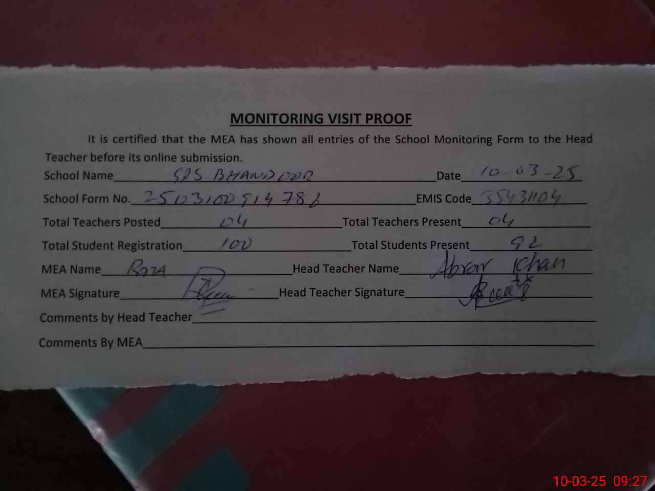 | Attendance Register | Head Teacher | MEA with School | Visit Proof |