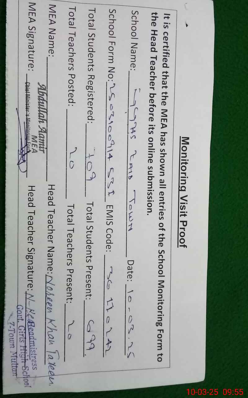 | EMIS Code: 36110242 | Name of School: GGHS ZAID TOWN PHASE NO.2 PIRAN GHAIB ROAD MULTAN | |||