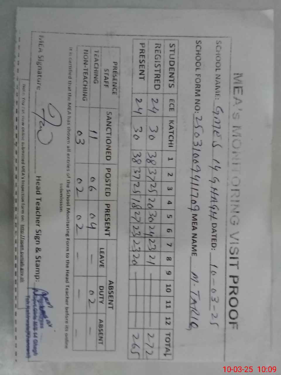 | Attendance Register | Head Teacher | MEA with School | Visit Proof |