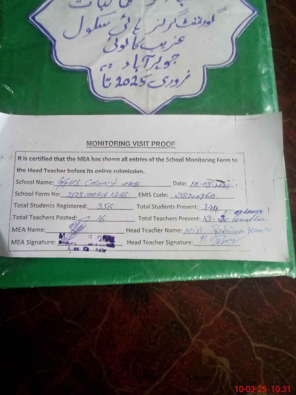 | EMIS Code: 38210960 | Name of School: GGHS GHAREEB COLONY JAUHARABAD | |||