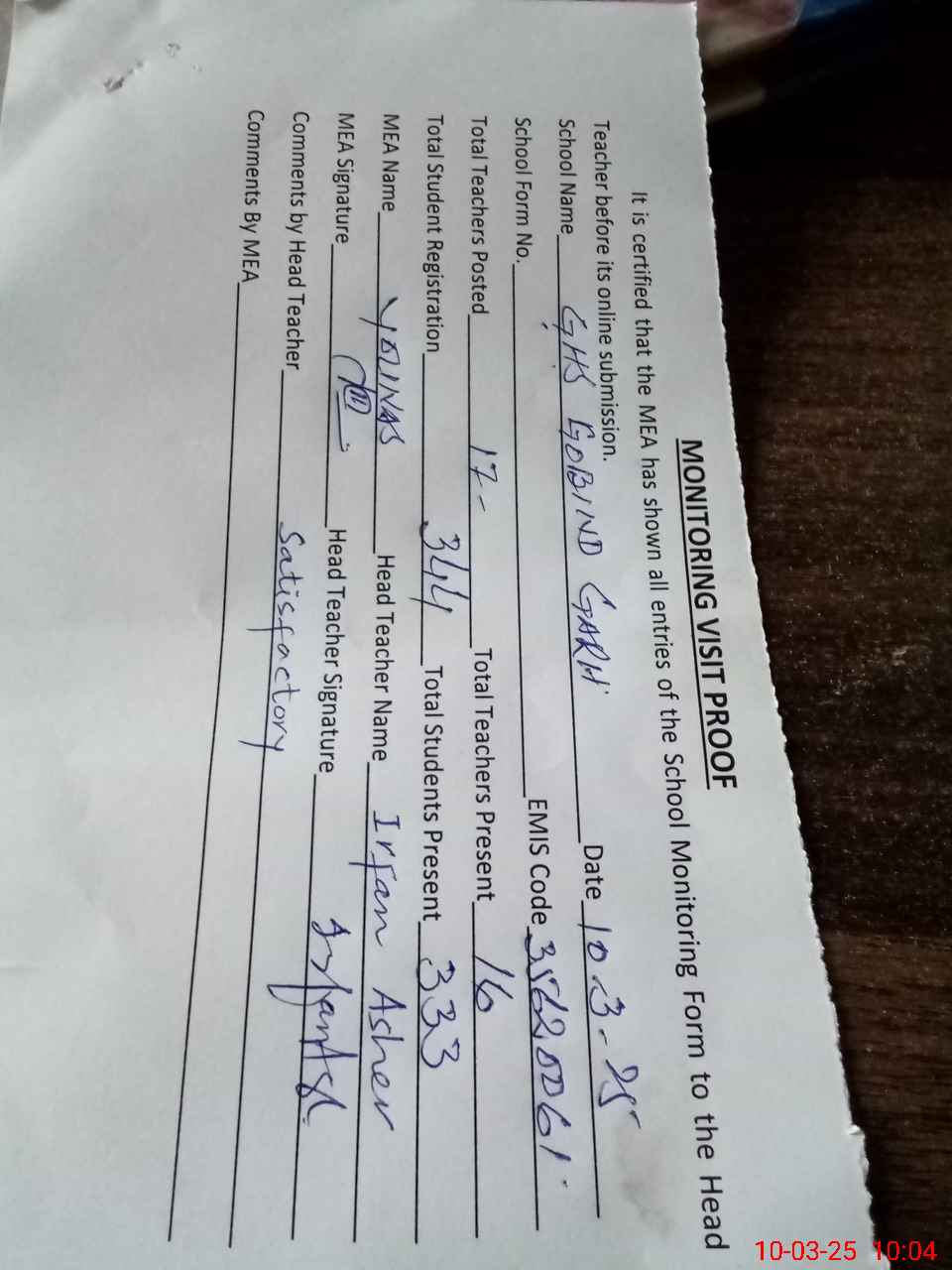 | EMIS Code: 35620061 | Name of School: GHS GOBIND GARH 12 RB | |||