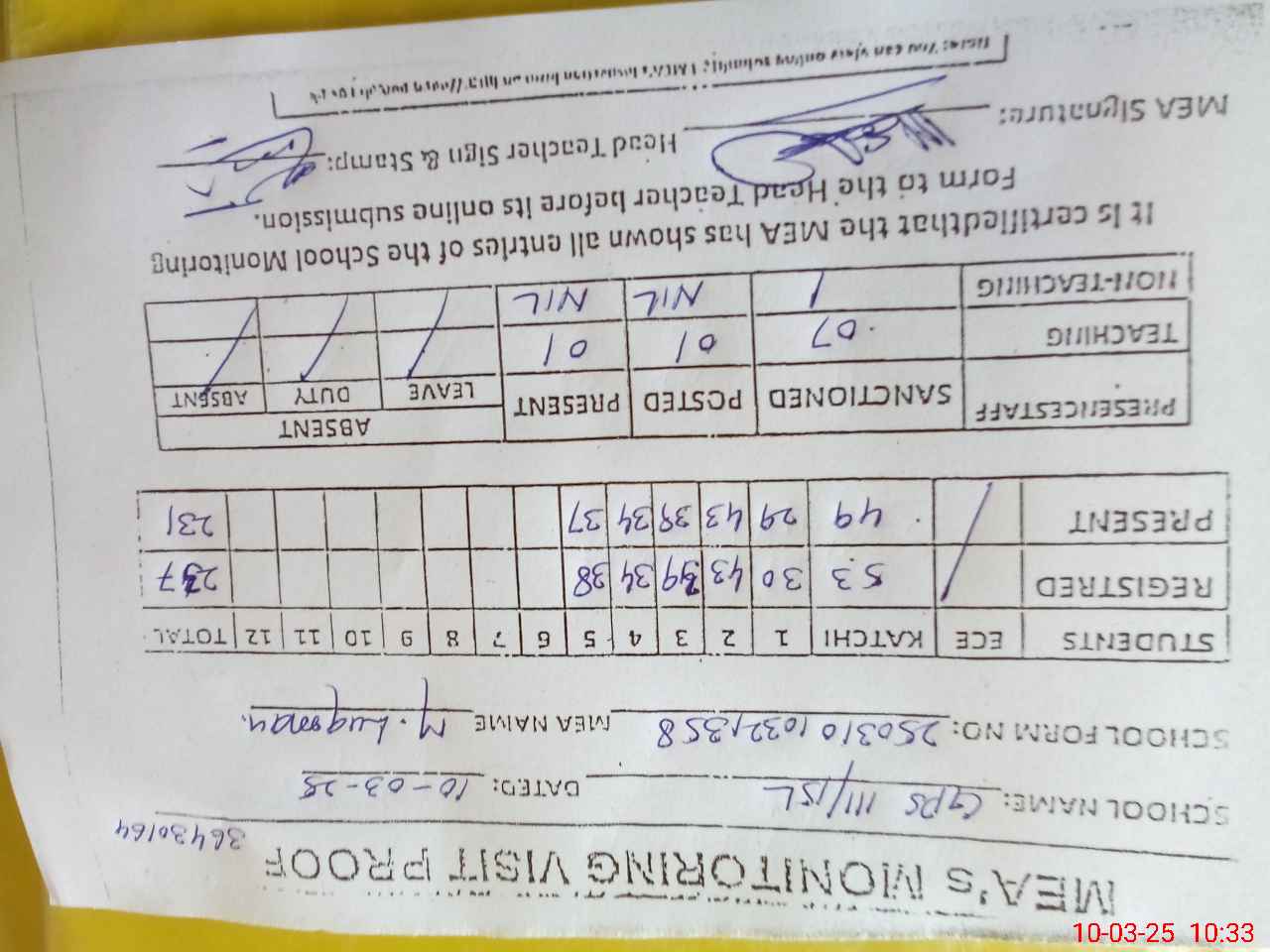 | Attendance Register | Head Teacher | MEA with School | Visit Proof |
