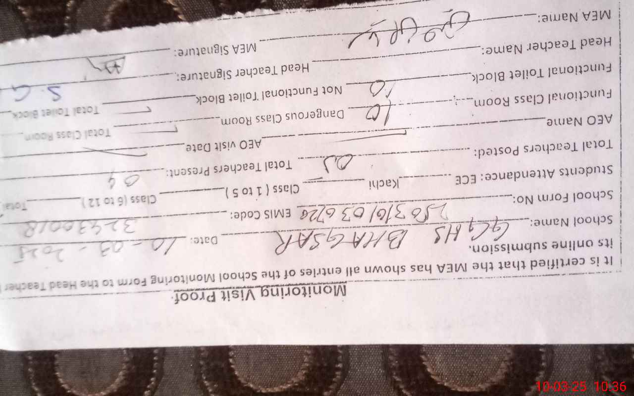 | Certified that this School was Inspected by the Undersigned MEA/DMO Today and the Information Stated Above is as Per Record. | |||||