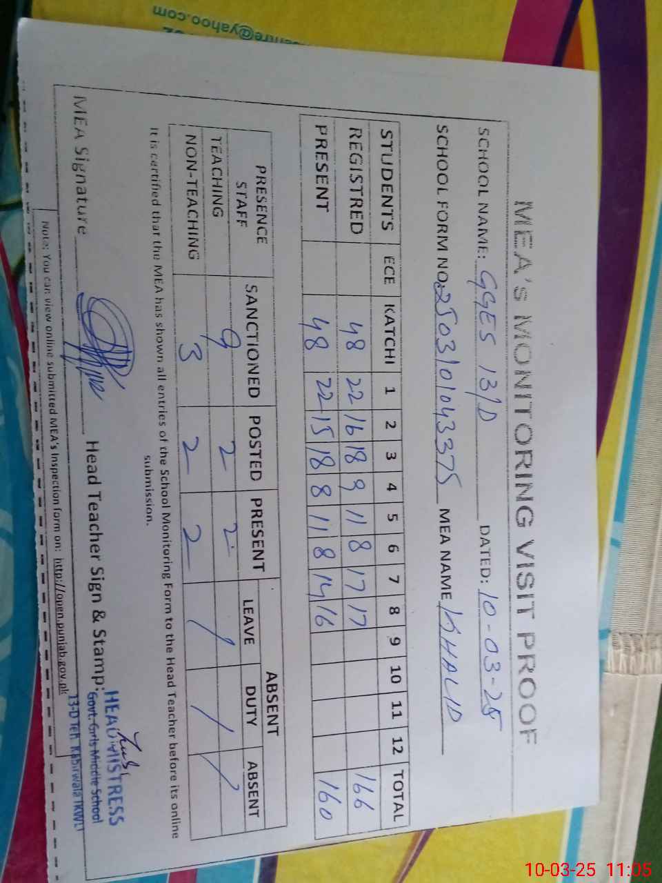 | Attendance Register | Head Teacher | MEA with School | Visit Proof |