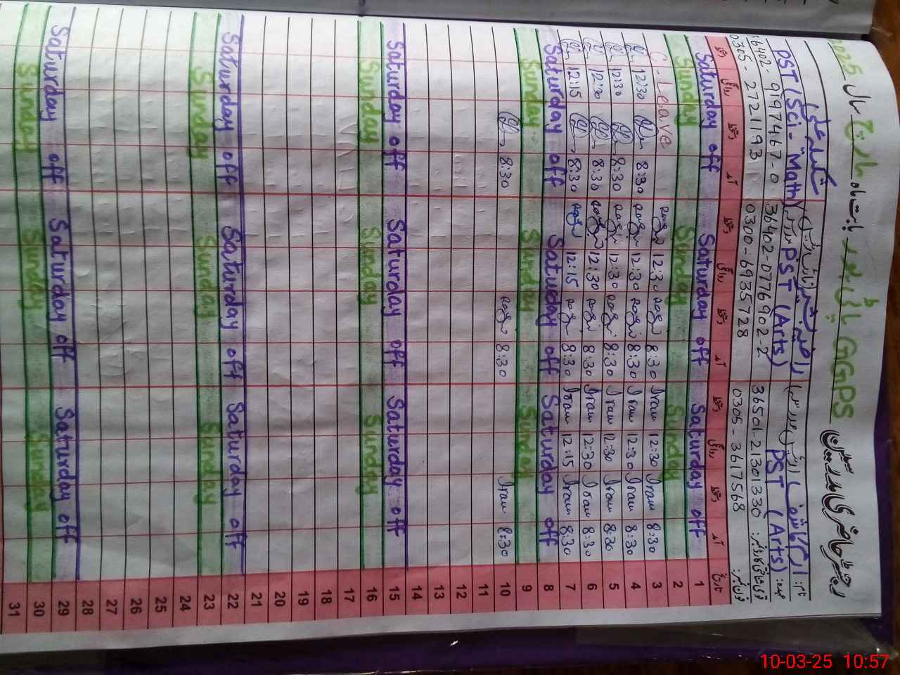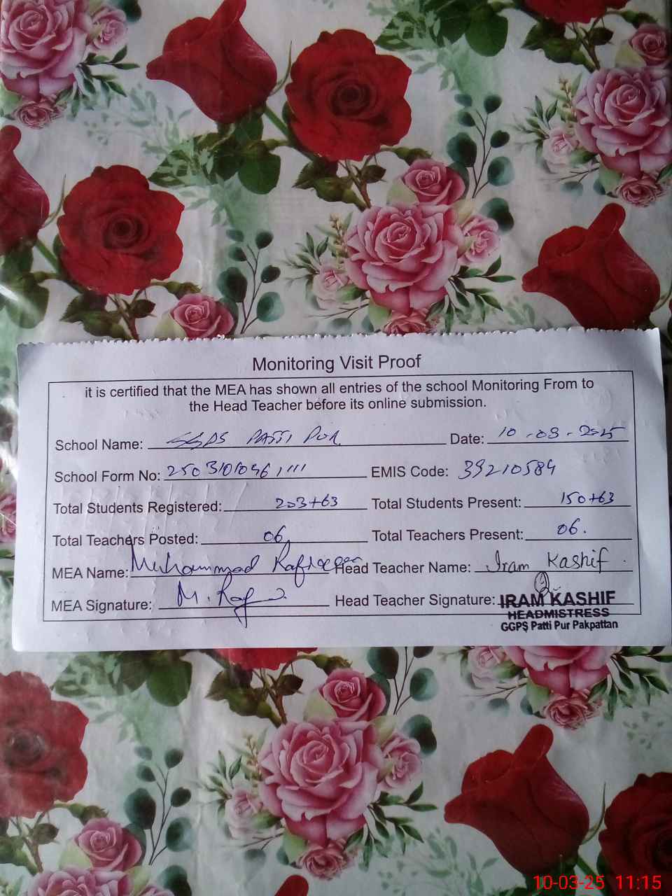 | Name: Ir**** Ka**** Designation: (School Headmaster's/Headmistress's) PST Phone/Cell Number: 03**** |