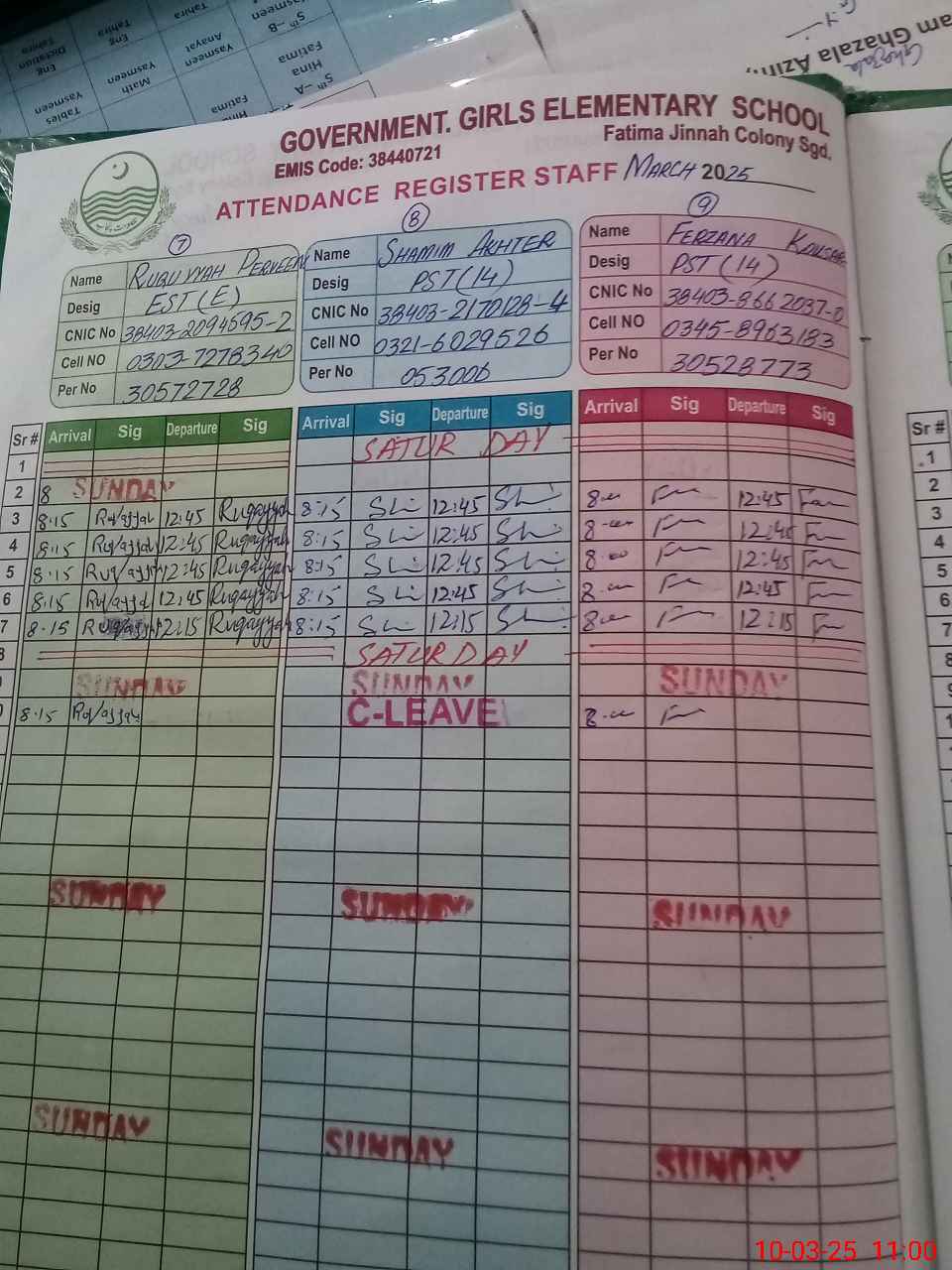 | CNIC | Full Name | Designation | R/C | Absence During Last Calender Month |