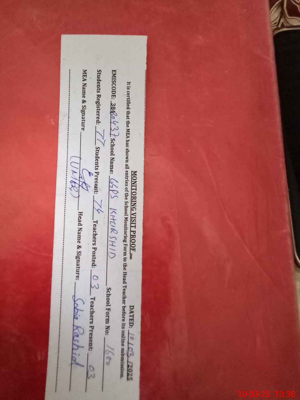 | Certified that this School was Inspected by the Undersigned MEA/DMO Today and the Information Stated Above is as Per Record. | |||||