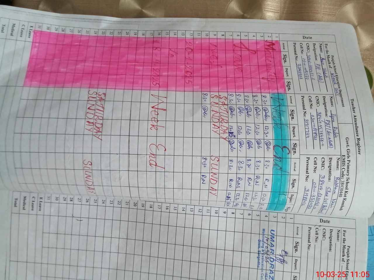 | CNIC | Full Name | Designation | R/C | Absence During Last Calender Month |