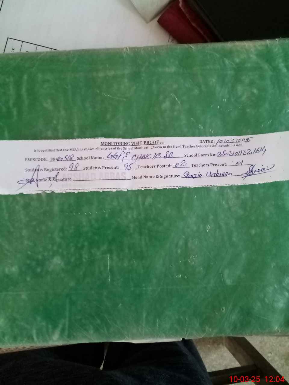 | Attendance Register | Head Teacher | MEA with School | Visit Proof |