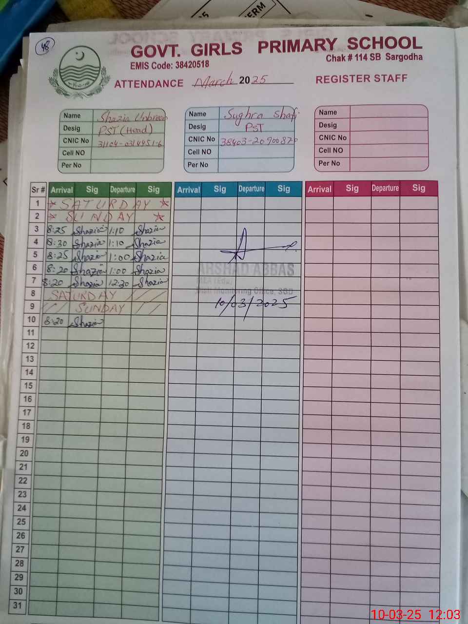 | Name: SH**** UN**** Designation: (School Headmaster's/Headmistress's) PST Phone/Cell Number: 03**** |