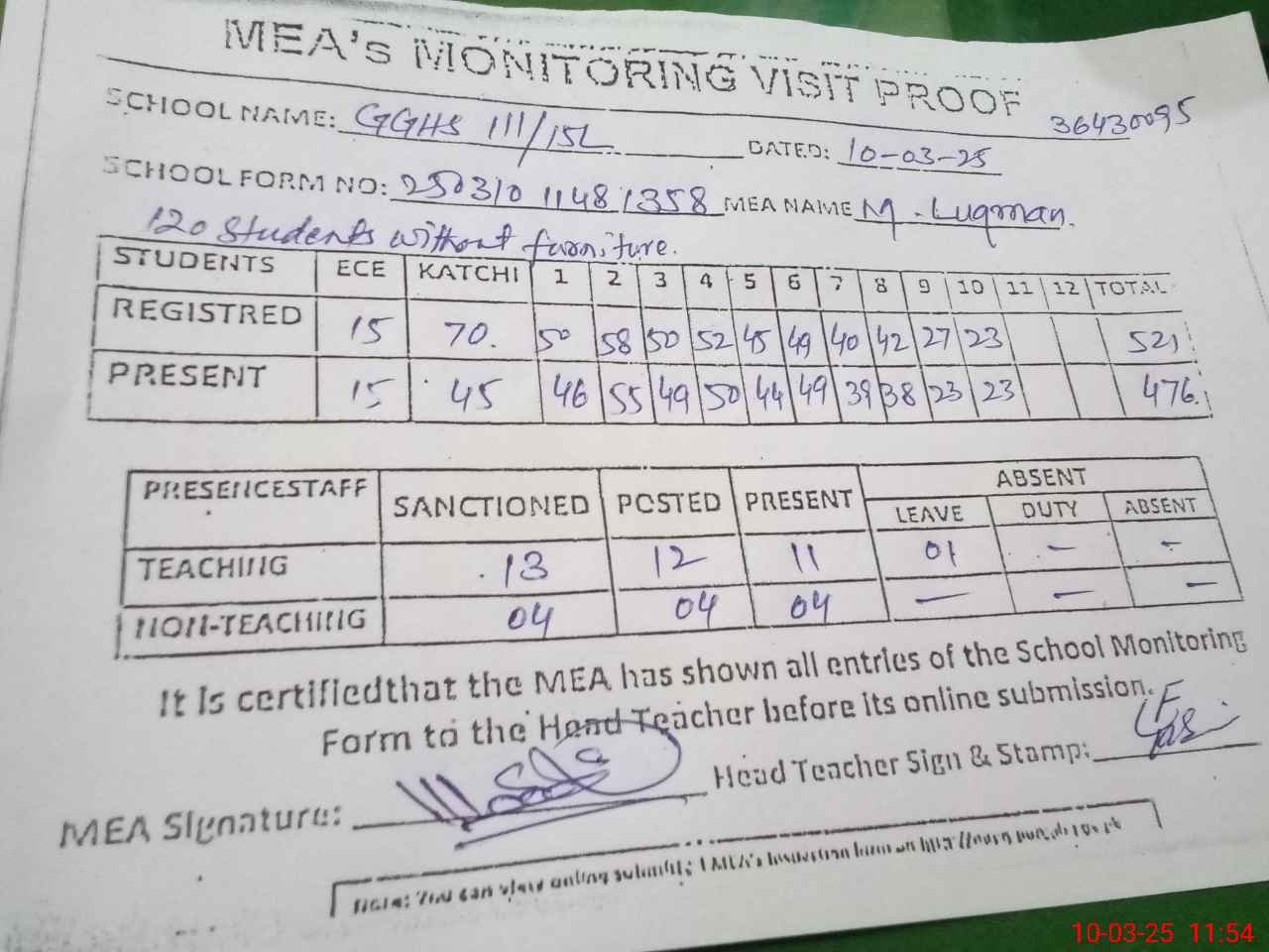 | Attendance Register | Head Teacher | MEA with School | Visit Proof |