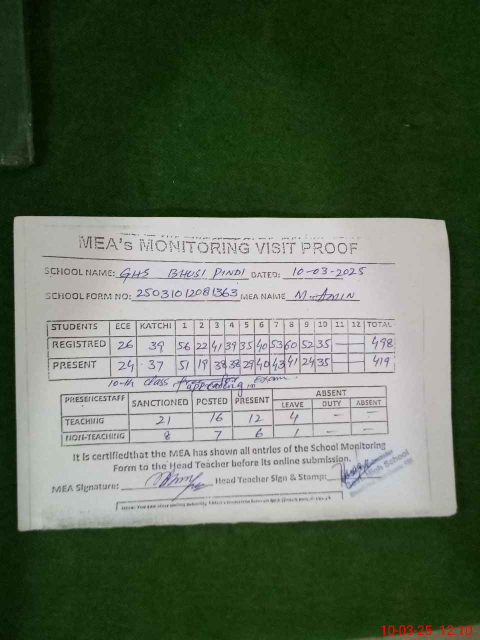 | Certified that this School was Inspected by the Undersigned MEA/DMO Today and the Information Stated Above is as Per Record. | |||||