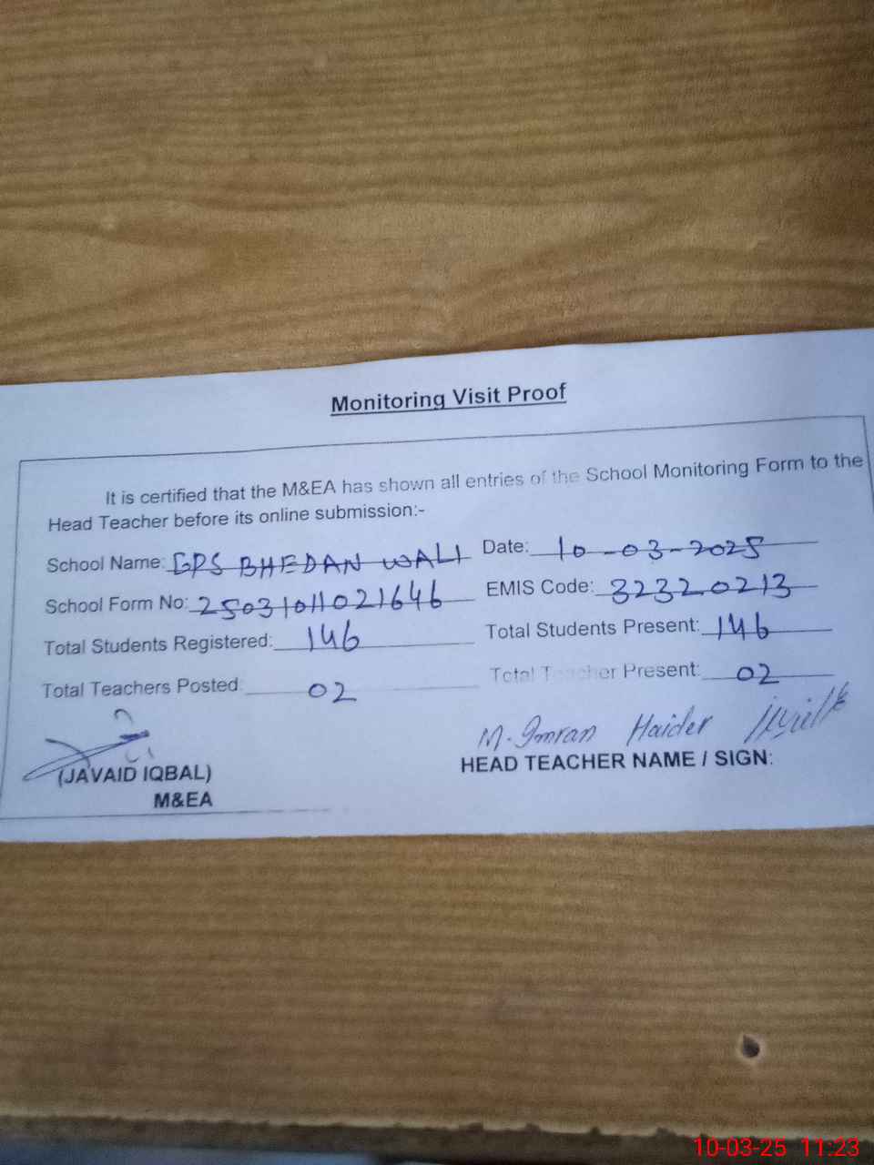 | Attendance Register | Head Teacher | MEA with School | Visit Proof |