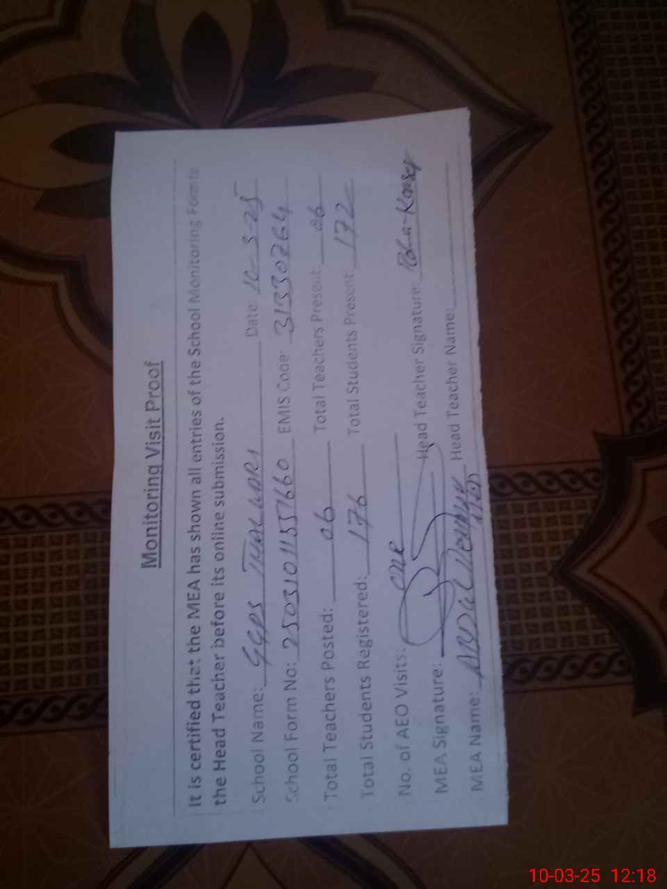 | Attendance Register | Head Teacher | MEA with School | Visit Proof |