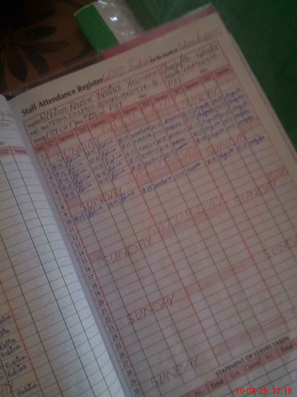 | CNIC | Full Name | Designation | R/C | Absence During Last Calender Month |
