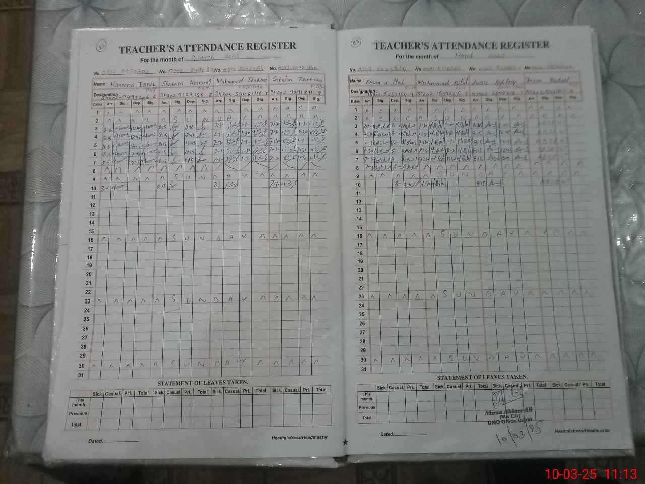 | Total no. of Classrooms: 13 No. of Classrooms Used for Teaching: 13 No. of Classrooms Storing Old Furniture, FTBs, etc: 0Comments if Any: JC Awais Ashfaq and Muhammad Bilal found absent as no entery on movement register No NSB and FTF fresh bank statements not available |