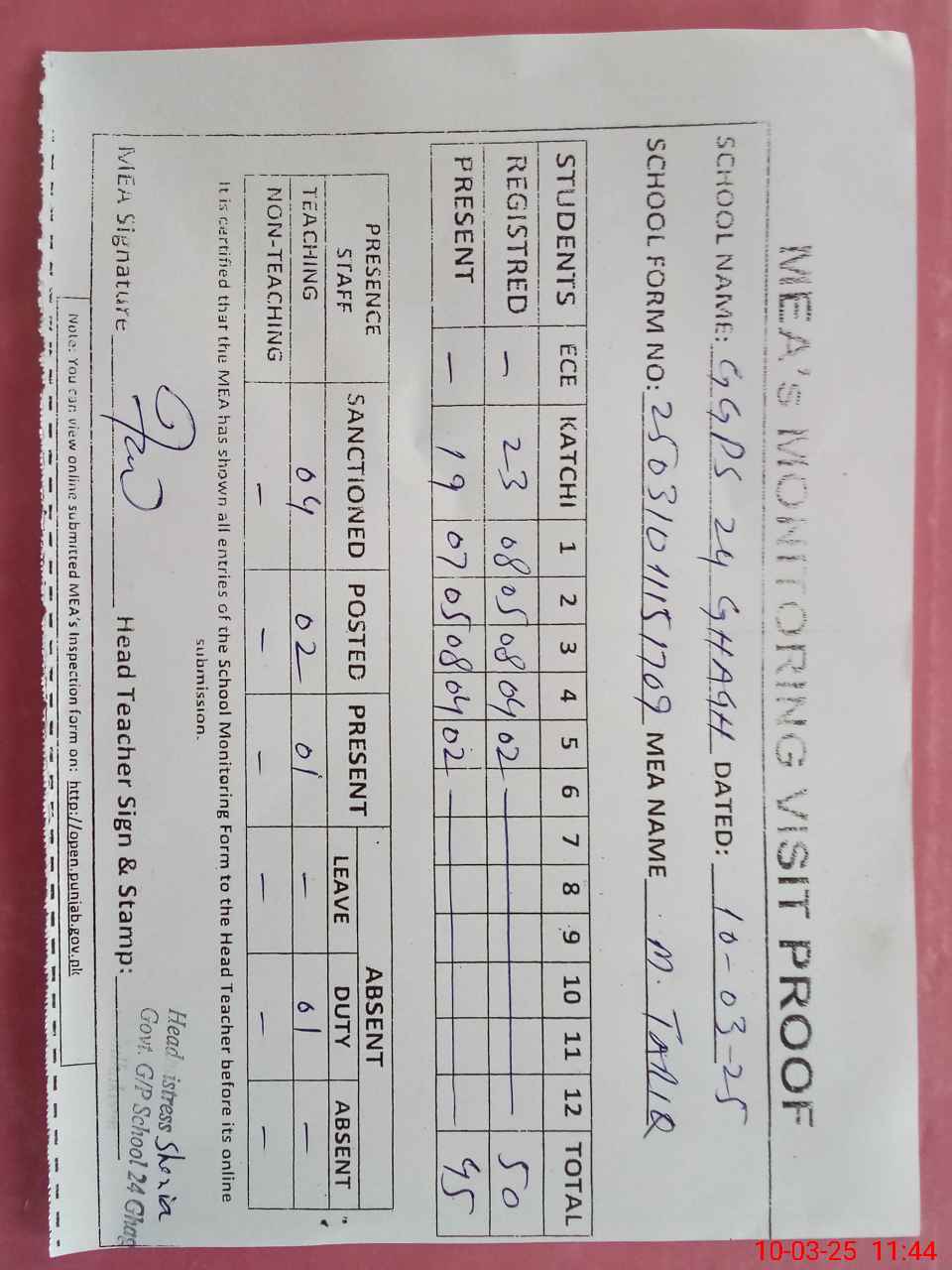 | Attendance Register | Head Teacher | MEA with School | Visit Proof |