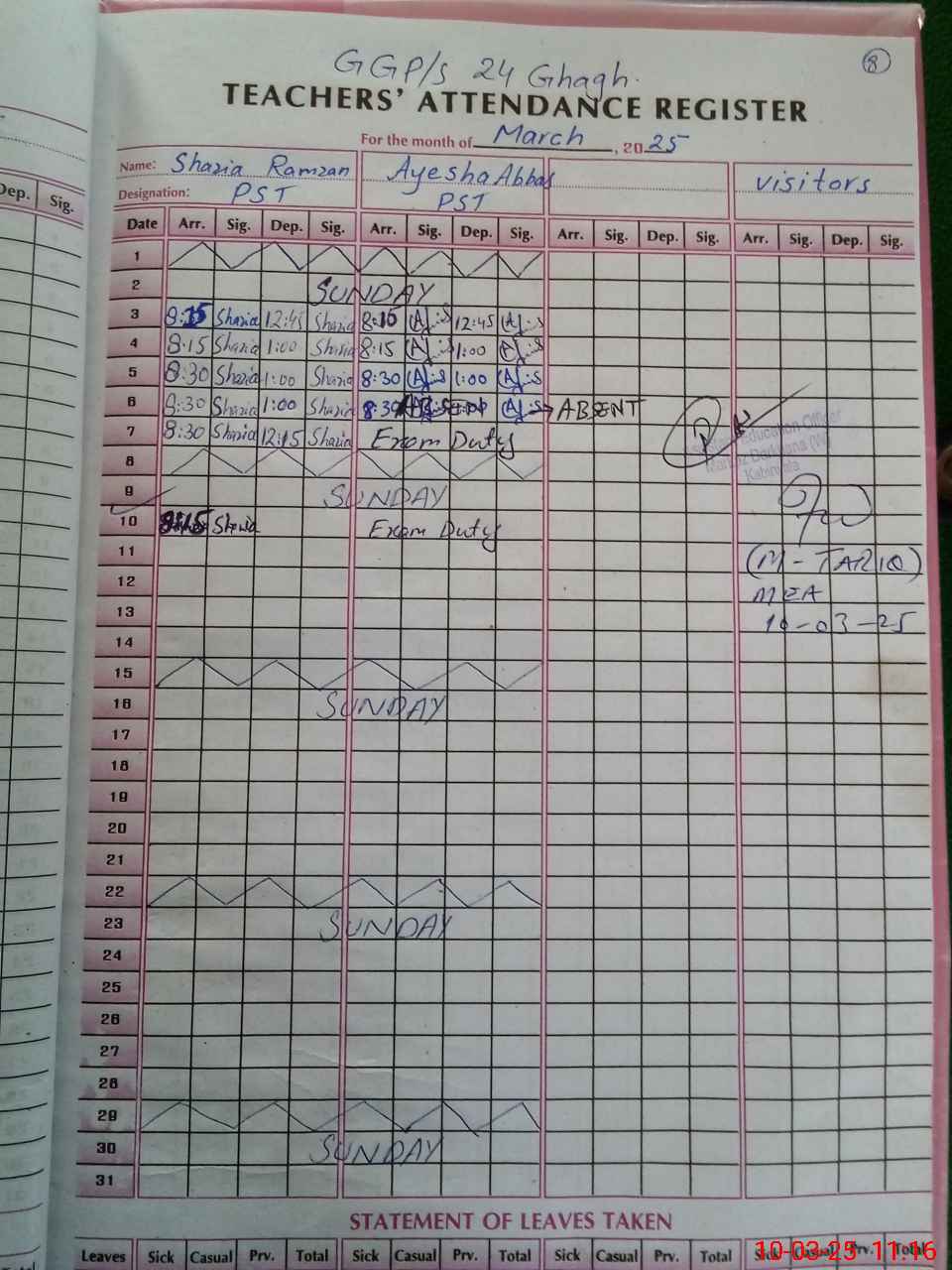 | 36**** | Ai**** Ab**** | 1 | 1 | 0 | 0 | 0 | 0 | 0 | 0 | 0 | 0 | 0 | Exam Duty |