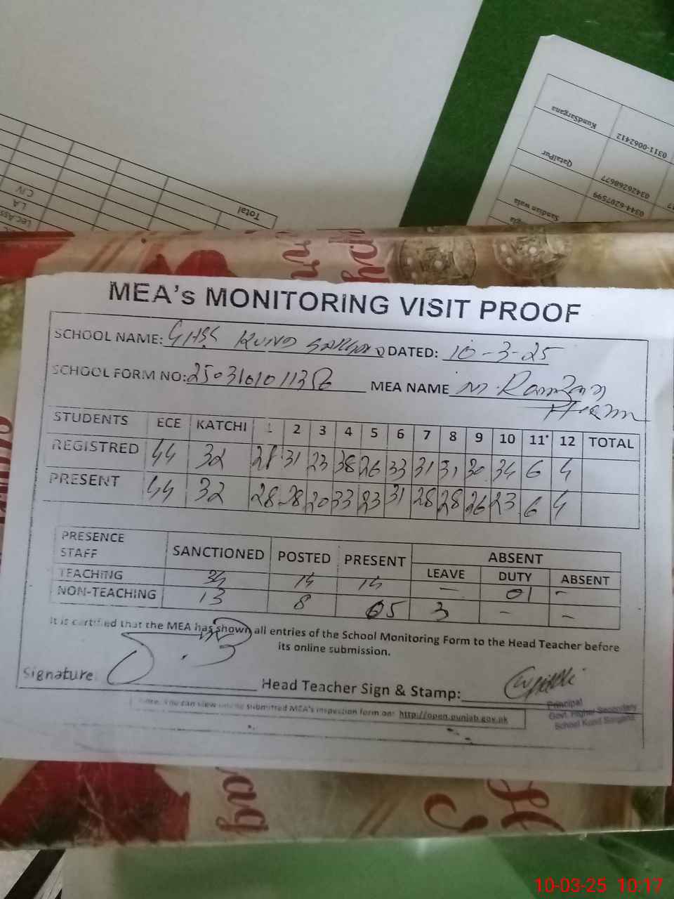 | Attendance Register | Head Teacher | MEA with School | Visit Proof |