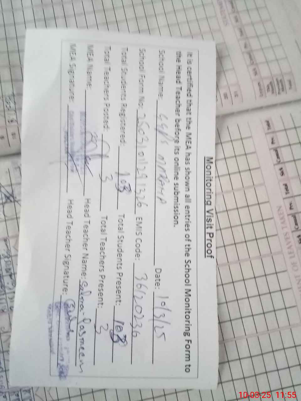 | Attendance Register | Head Teacher | MEA with School | Visit Proof |