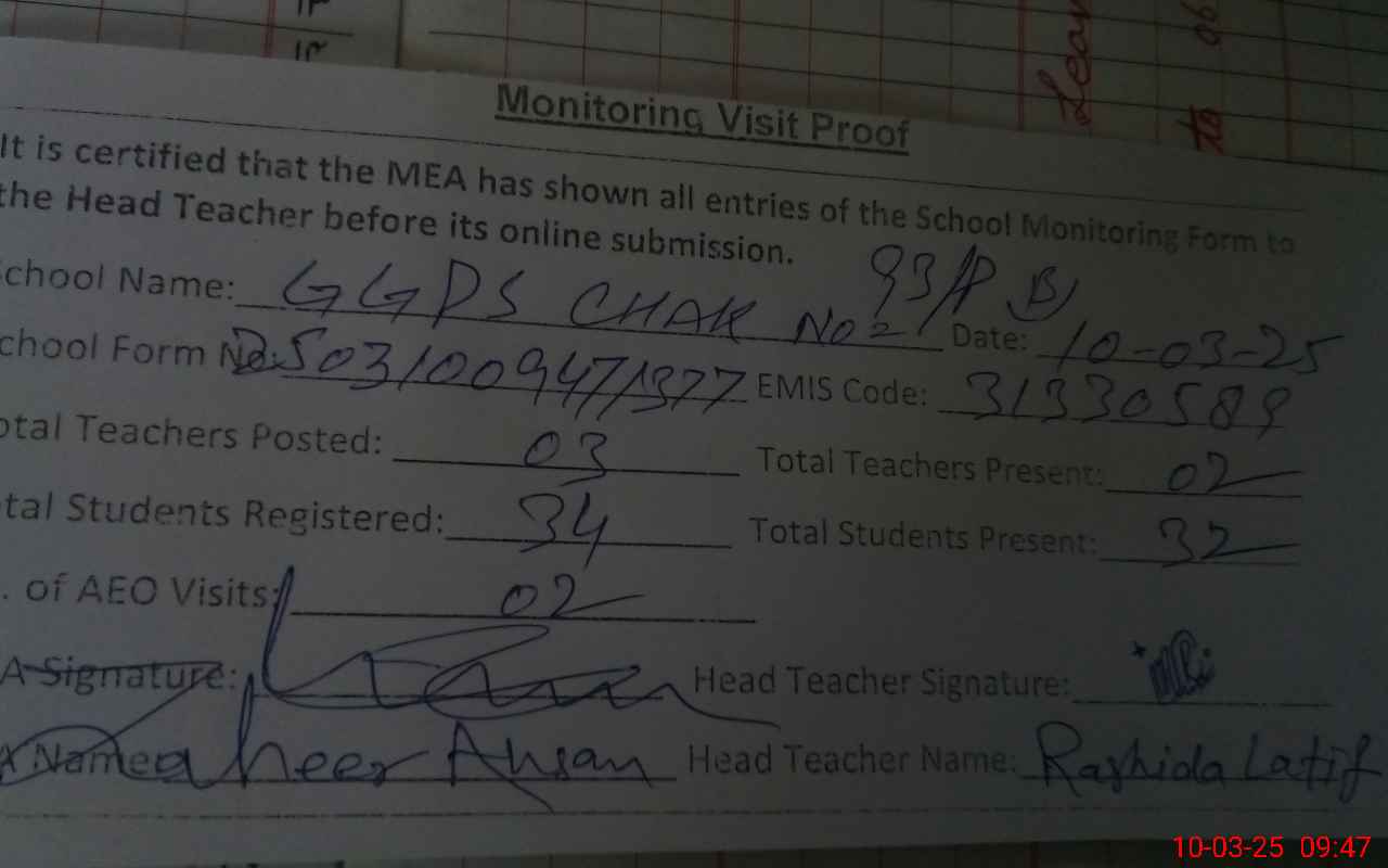 | Monitoring Date: 10-03-2025 | Start Time: 10-03-2025 09:18 AM | End Time: 10-03-2025 09:52 AM | Name of MEA: Za**** Ah**** | |