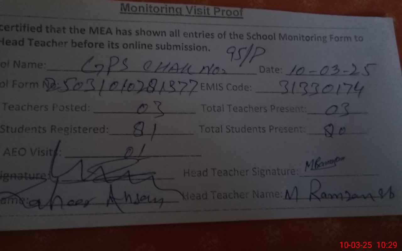 | Attendance Register | Head Teacher | MEA with School | Visit Proof |