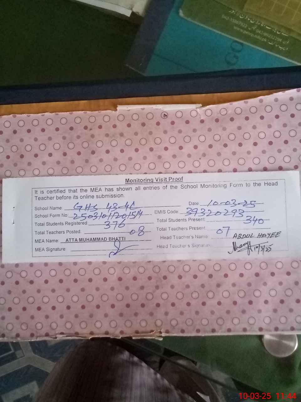 | Certified that this School was Inspected by the Undersigned MEA/DMO Today and the Information Stated Above is as Per Record. | |||||
